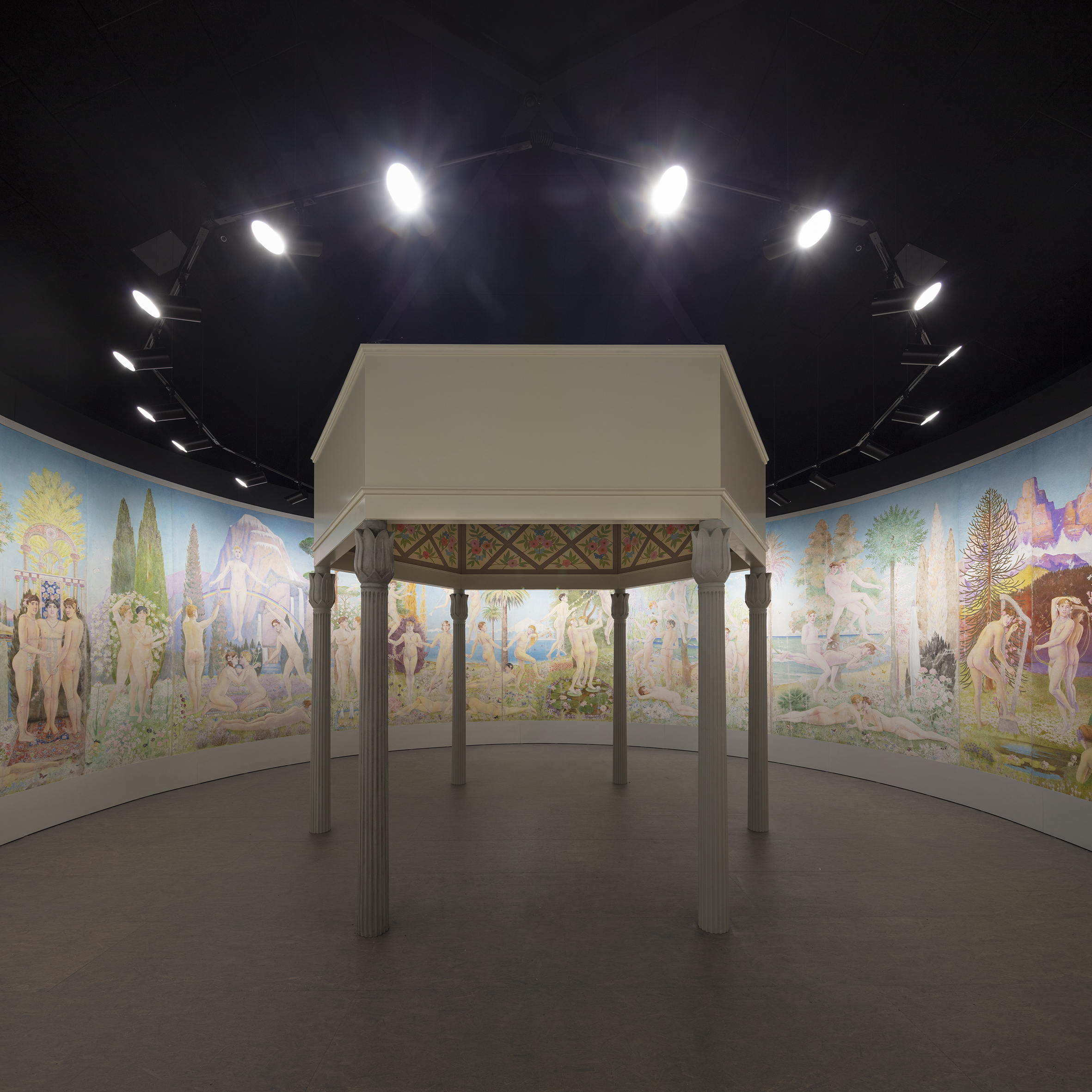 The mounting of the Elisarion Pavilion with the reconstructed canopy gives a lively impression of this unique artistic creation. It consists of 16 canvases and presents 84 male nudes arranged in 33 scenes. An accompanying historical exhibition, curated by Andreas Schwab, presents Elisàr von Kupffer and Eduard von Mayer, who together founded “Clarism” as a new religion.